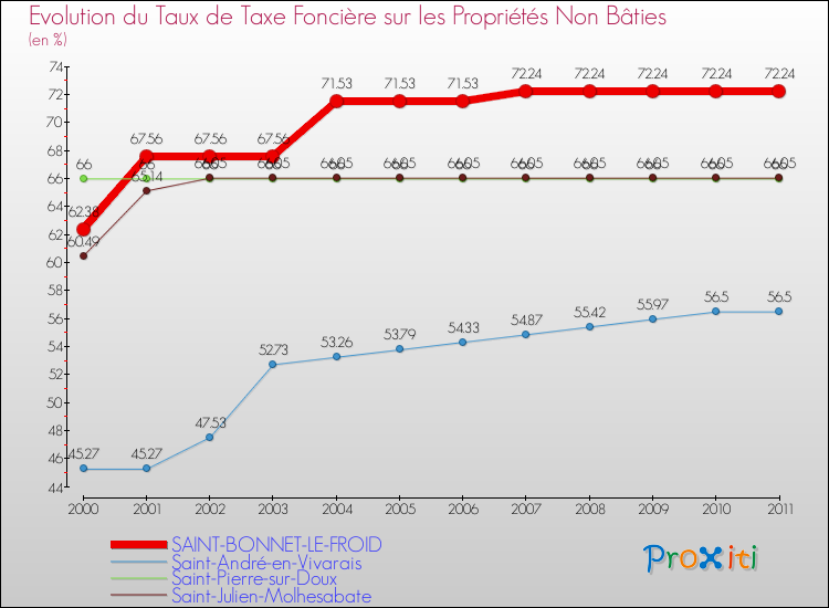 A Saint-Bonnet-le-Froid, le taux de taxe foncière sur le non bâti a donc augmenté de 15.81 % entre 2000 et 2011.