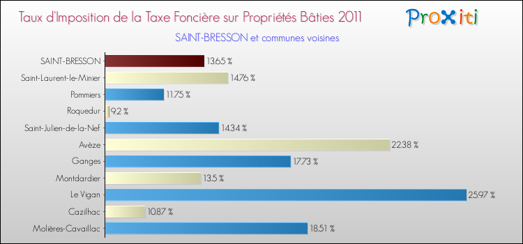 A noter : la valeur moyenne de ce taux de taxe foncière sur le bâti dans les communes françaises similaires à Saint-Bresson était de 13.59 %, en 2011.