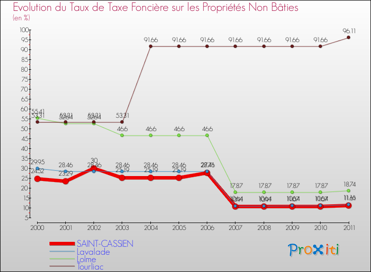 A Saint-Cassien, le taux de taxe foncière sur le non bâti a donc baissé de 54.49 % entre 2000 et 2011.