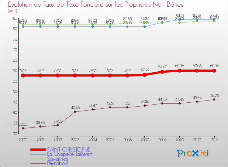 A Saint-Christophe, le taux de taxe foncière sur le non bâti a donc augmenté de 4.09 % entre 2000 et 2011.