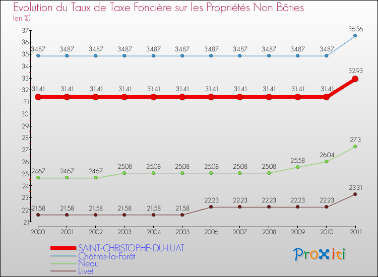 Pendant la même période, les communes françaises similaires à Saint-Christophe-du-Luat, ont vu leur taux de taxe foncière sur le non bâti augmenter de 9.13 % en moyenne entre 2000 et 2011.