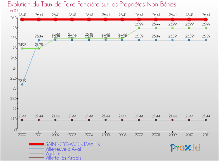 En 2011, le taux de la taxe foncière sur le non bâti vôté par le conseil municipal de Saint-Cyr-Montmalin était de : 26.41 %.