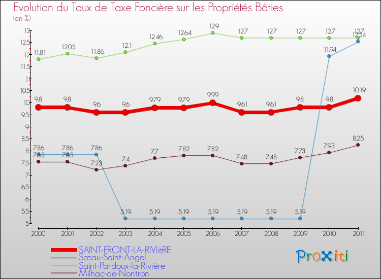 Pendant la même période, les communes françaises similaires à Saint-Front-la-Rivière, ont vu leur taux de taxe foncière sur le bâti augmenter de 4.6 % en moyenne entre 2000 et 2011.