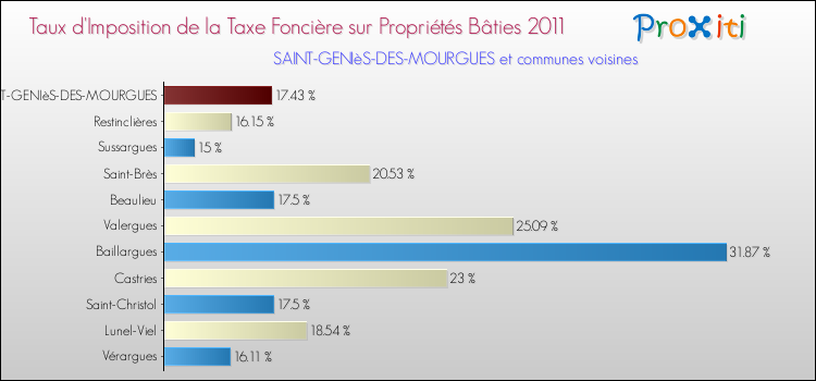 A noter : la valeur moyenne de ce taux de taxe foncière sur le bâti dans les communes françaises similaires à Saint-Geniès-des-Mourgues était de 15.82 %, en 2011.