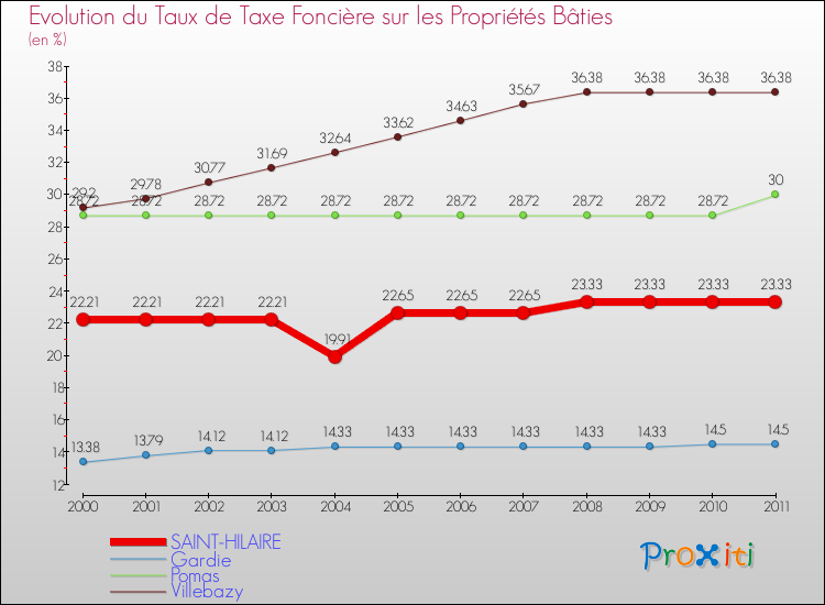 Pendant la même période, les communes françaises similaires à Saint-Hilaire, ont vu leur taux de taxe foncière sur le bâti augmenter de 19.31 % en moyenne entre 2000 et 2011.