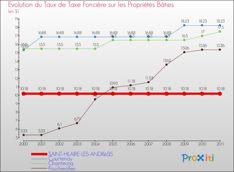 A Saint-Hilaire-les-Andrésis, le taux de taxe foncière sur le bâti a donc augmenté de 0 % entre 2000 et 2011.