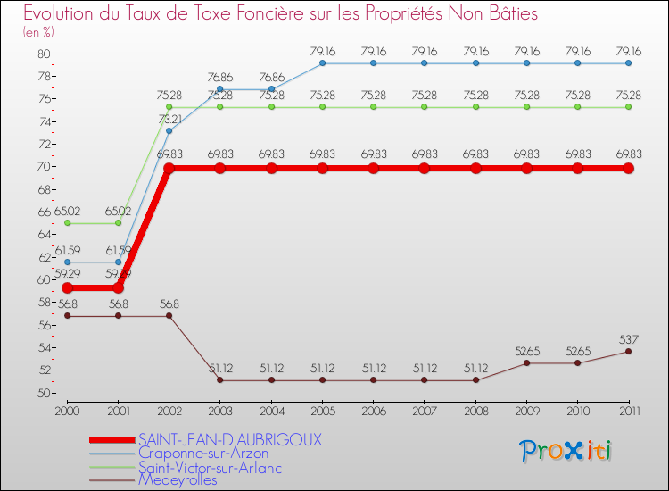 A Saint-Jean-d'Aubrigoux, le taux de taxe foncière sur le non bâti a donc augmenté de 17.78 % entre 2000 et 2011.