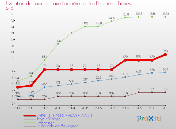 A Saint-Julien-de-Gras-Capou, le taux de taxe foncière sur le bâti a donc augmenté de 112.8 % entre 2000 et 2011.