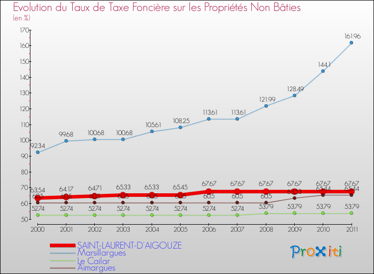 A Saint-Laurent-d'Aigouze, le taux de taxe foncière sur le non bâti a donc augmenté de 6.5 % entre 2000 et 2011.