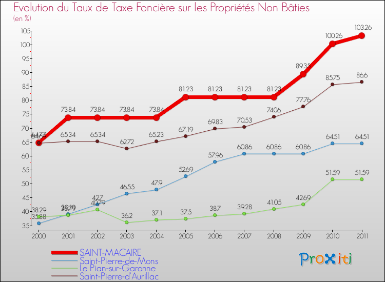 Pendant la même période, les communes françaises similaires à Saint-Macaire, ont vu leur taux de taxe foncière sur le non bâti augmenter de 29.17 % en moyenne entre 2000 et 2011.