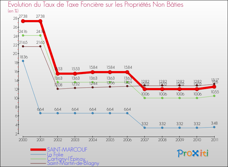 A Saint-Marcouf, le taux de taxe foncière sur le non bâti a donc baissé de 53.98 % entre 2000 et 2011.