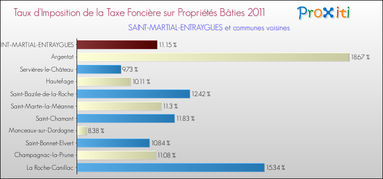 En 2011, le taux de la taxe foncière sur le bâti vôté par le conseil municipal de Saint-Martial-Entraygues était de : 11.15 %.