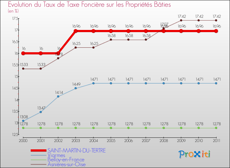 En 2011, le taux de la taxe foncière sur le bâti vôté par le conseil municipal de Saint-Martin-du-Tertre était de : 16.96 %.