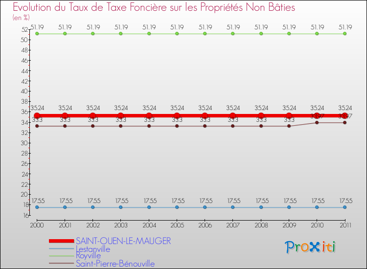A Saint-Ouen-le-Mauger, le taux de taxe foncière sur le non bâti a donc augmenté de 0 % entre 2000 et 2011.