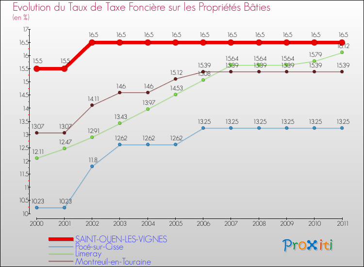 En 2011, le taux de la taxe foncière sur le bâti vôté par le conseil municipal de Saint-Ouen-les-Vignes était de : 16.5 %.