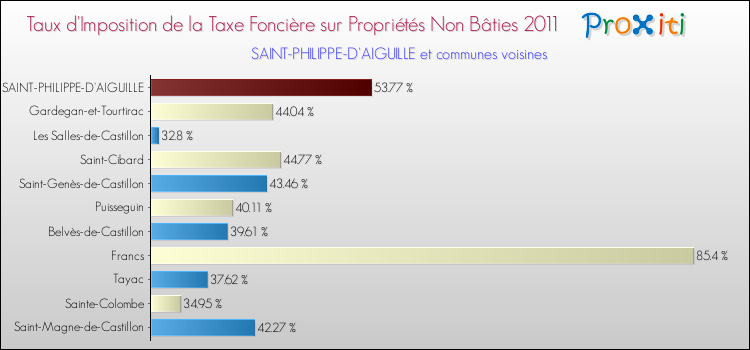 En 2011, le taux de la taxe foncière sur le non bâti vôté par le conseil municipal de Saint-Philippe-d'Aiguille était de : 53.77 %.