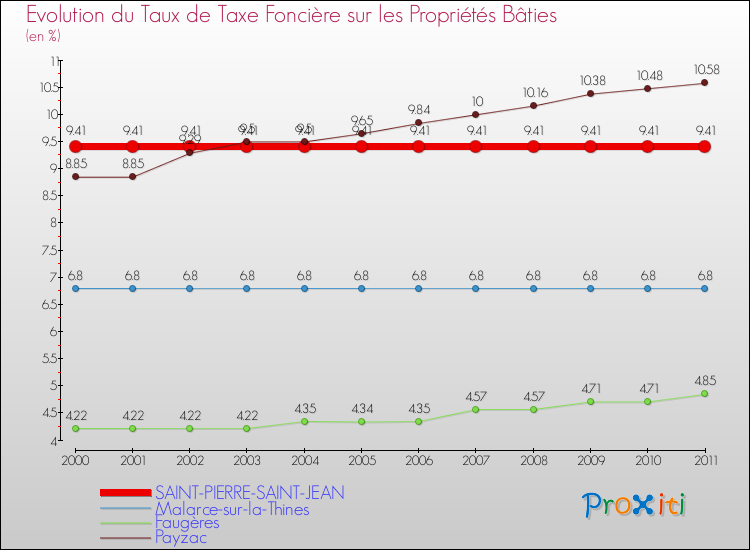 A Saint-Pierre-Saint-Jean, le taux de taxe foncière sur le non bâti a donc augmenté de 4.85 % entre 2000 et 2011.