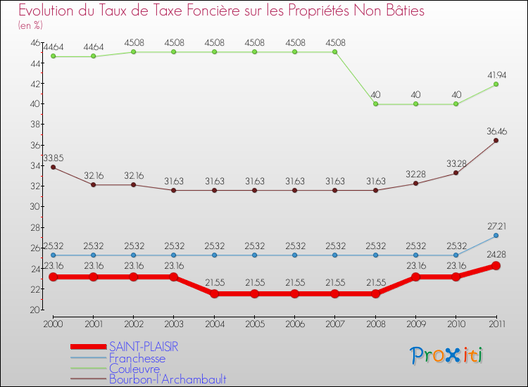 Pendant la même période, les communes françaises similaires à Saint-Plaisir, ont vu leur taux de taxe foncière sur le non bâti baisser de 11.8 % en moyenne entre 2000 et 2011.