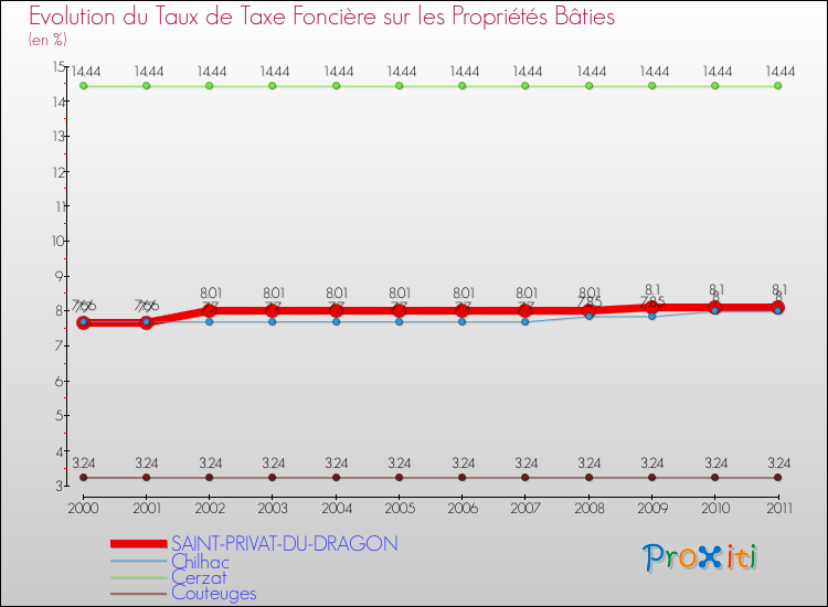 Pendant la même période, les communes françaises similaires à Saint-Privat-du-Dragon, ont vu leur taux de taxe foncière sur le bâti augmenter de 7.9 % en moyenne entre 2000 et 2011.