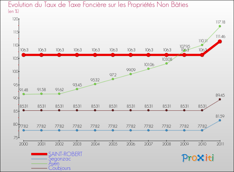 A Saint-Robert, le taux de taxe foncière sur le non bâti a donc augmenté de 4.85 % entre 2000 et 2011.