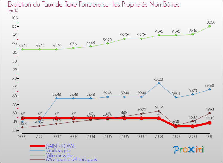Pendant la même période, les communes françaises similaires à Saint-Rome, ont vu leur taux de taxe foncière sur le non bâti baisser de 16.07 % en moyenne entre 2000 et 2011.