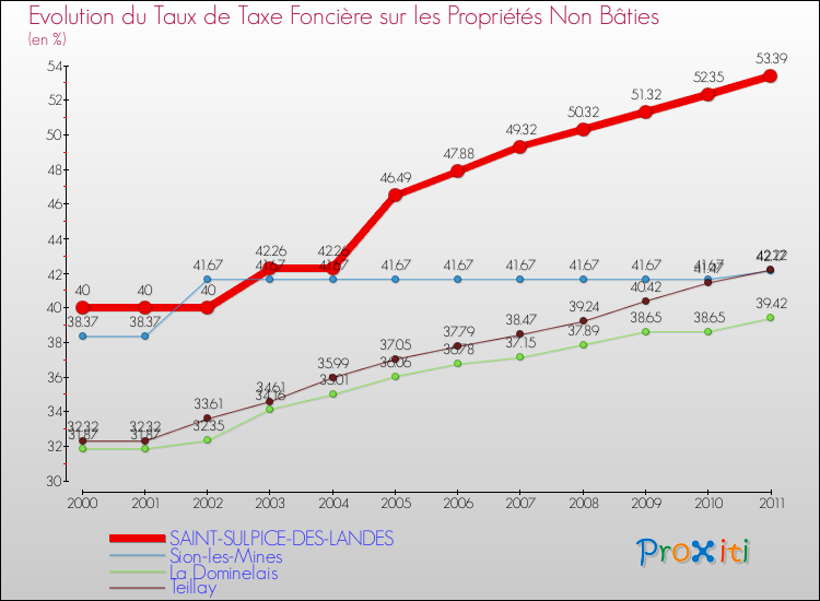 A Saint-Sulpice-des-Landes, le taux de taxe foncière sur le non bâti a donc augmenté de 33.48 % entre 2000 et 2011.