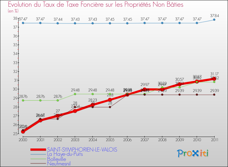 Pendant la même période, les communes françaises similaires à Saint-Symphorien-le-Valois, ont vu leur taux de taxe foncière sur le non bâti augmenter de 40.51 % en moyenne entre 2000 et 2011.