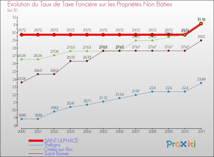 A Saint-Ulphace, le taux de taxe foncière sur le non bâti a donc augmenté de 4.85 % entre 2000 et 2011.
