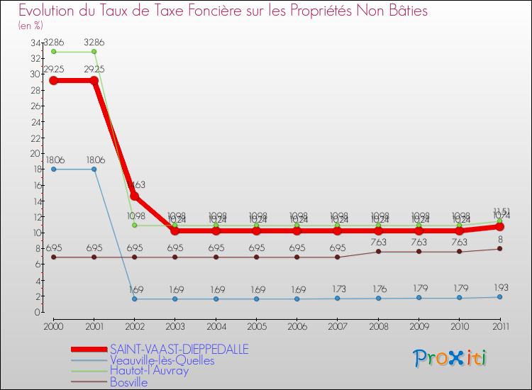 A Saint-Vaast-Dieppedalle, le taux de taxe foncière sur le non bâti a donc baissé de 63.28 % entre 2000 et 2011.