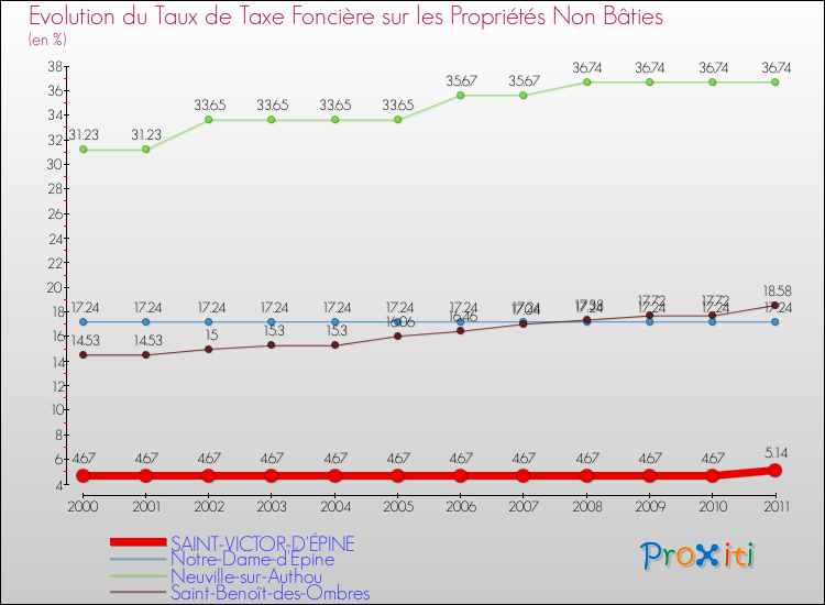 A Saint-Victor-d'Épine, le taux de taxe foncière sur le non bâti a donc augmenté de 10.06 % entre 2000 et 2011.
