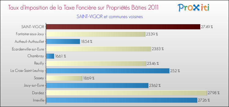 En 2011, le taux de la taxe foncière sur le bâti vôté par le conseil municipal de Saint-Vigor était de : 27.49 %.