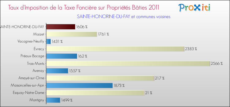 En 2011, le taux de la taxe foncière sur le bâti vôté par le conseil municipal de Sainte-Honorine-du-Fay était de : 16.06 %.