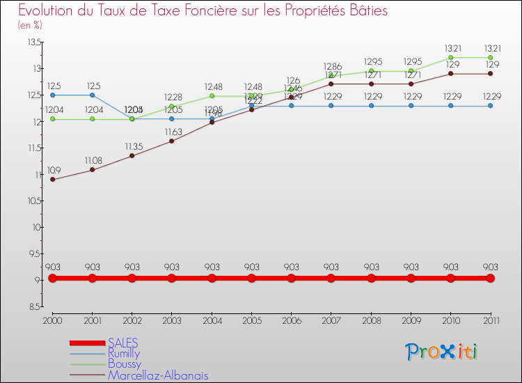 A Sales, le taux de taxe foncière sur le bâti a donc augmenté de 0 % entre 2000 et 2011.