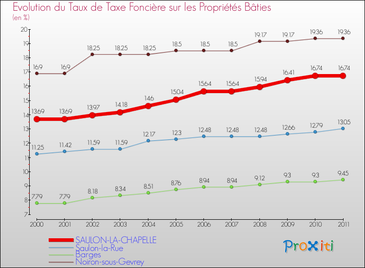 En 2011, le taux de la taxe foncière sur le bâti vôté par le conseil municipal de Saulon-la-Chapelle était de : 16.74 %.