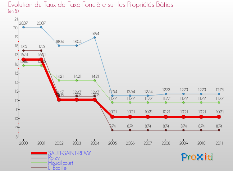 A Sault-Saint-Remy, le taux de taxe foncière sur le bâti a donc baissé de 38.16 % entre 2000 et 2011.