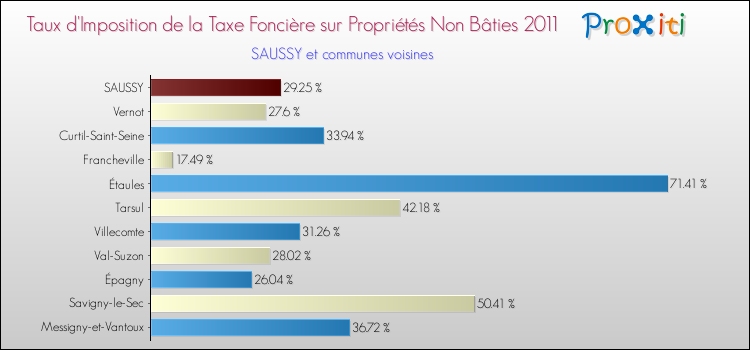 A noter : la valeur moyenne de ce taux de taxe foncière sur le non bâti dans les communes françaises similaires à Saussy était de 25.53 %, en 2011.