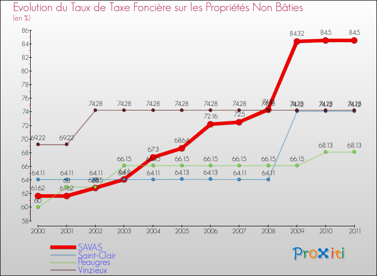 A Savas, le taux de taxe foncière sur le non bâti a donc augmenté de 37.13 % entre 2000 et 2011.