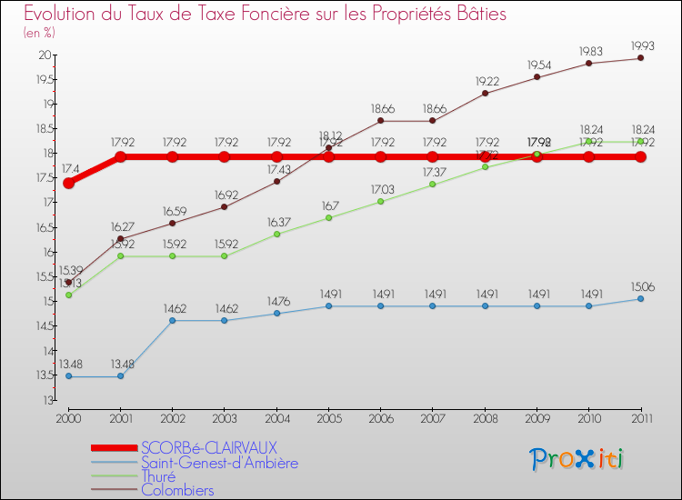 A Scorbé-Clairvaux, le taux de taxe foncière sur le bâti a donc augmenté de 2.99 % entre 2000 et 2011.