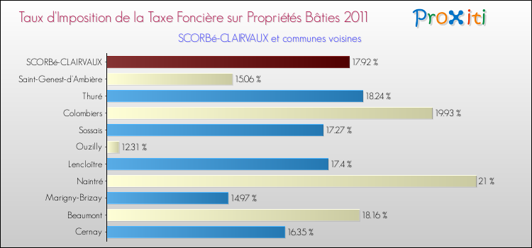 A noter : la valeur moyenne de ce taux de taxe foncière sur le bâti dans les communes françaises similaires à Scorbé-Clairvaux était de 15.13 %, en 2011.