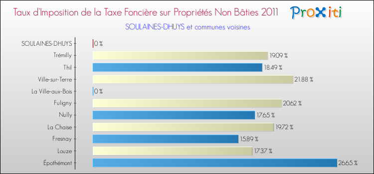 Pendant la même période, les communes françaises similaires à Soulaines-Dhuys, ont vu leur taux de taxe foncière sur le non bâti augmenter de 30.31 % en moyenne entre 2000 et 2011.