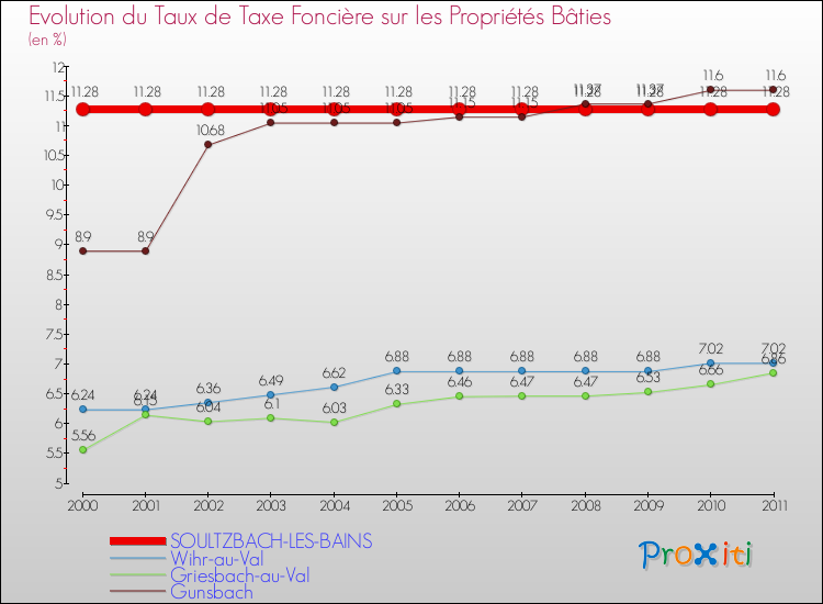 A Soultzbach-les-Bains, le taux de taxe foncière sur le bâti a donc augmenté de 0 % entre 2000 et 2011.