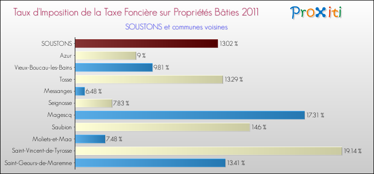 A noter : la valeur moyenne de ce taux de taxe foncière sur le bâti dans les communes françaises similaires à Soustons était de 20.88 %, en 2011.