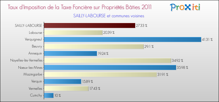 En 2011, le taux de la taxe foncière sur le bâti vôté par le conseil municipal de Sailly-Labourse était de : 27.33 %.