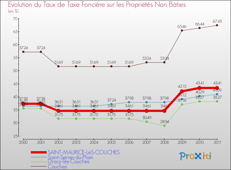 Pendant la même période, les communes françaises similaires à Saint-Maurice-lès-Couches, ont vu leur taux de taxe foncière sur le non bâti augmenter de 26.73 % en moyenne entre 2000 et 2011.