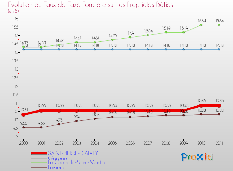 En 2011, le taux de la taxe foncière sur le bâti vôté par le conseil municipal de Saint-Pierre-d'Alvey était de : 10.86 %.