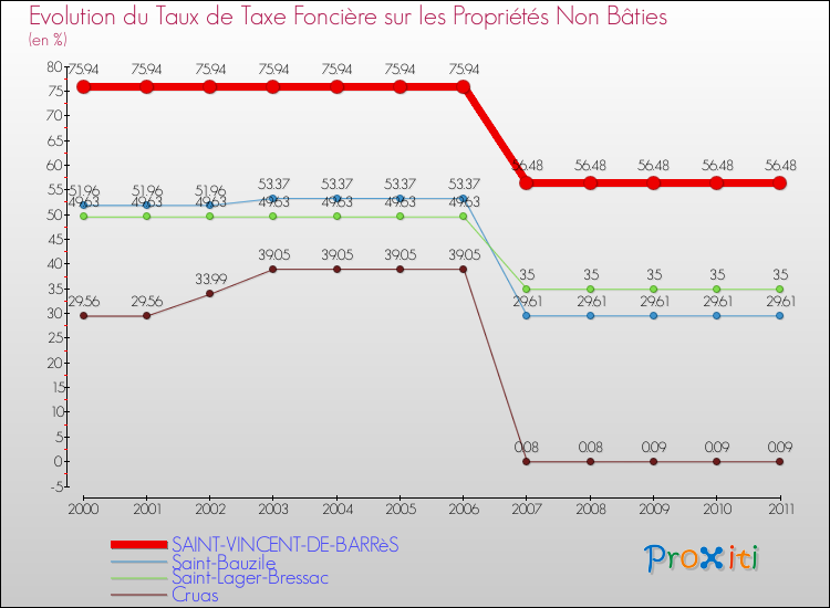 A Saint-Vincent-de-Barrès, le taux de taxe foncière sur le non bâti a donc baissé de 25.63 % entre 2000 et 2011.