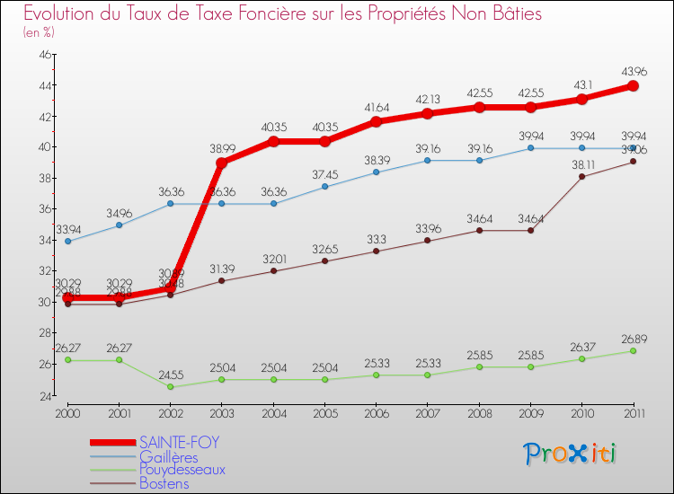 A Sainte-Foy, le taux de taxe foncière sur le non bâti a donc augmenté de 45.13 % entre 2000 et 2011.
