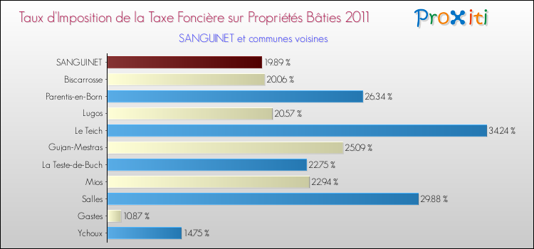 En 2011, le taux de la taxe foncière sur le bâti vôté par le conseil municipal de Sanguinet était de : 19.89 %.