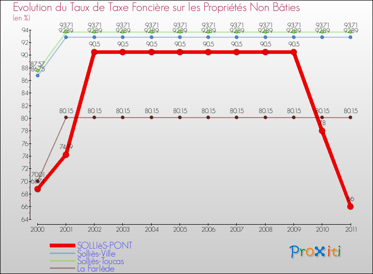 A Solliès-Pont, le taux de taxe foncière sur le non bâti a donc baissé de 3.99 % entre 2000 et 2011.