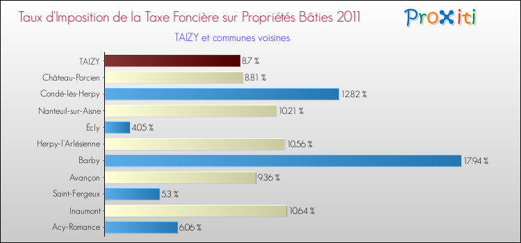A noter : la valeur moyenne de ce taux de taxe foncière sur le bâti dans les communes françaises similaires à Taizy était de 13.59 %, en 2011.